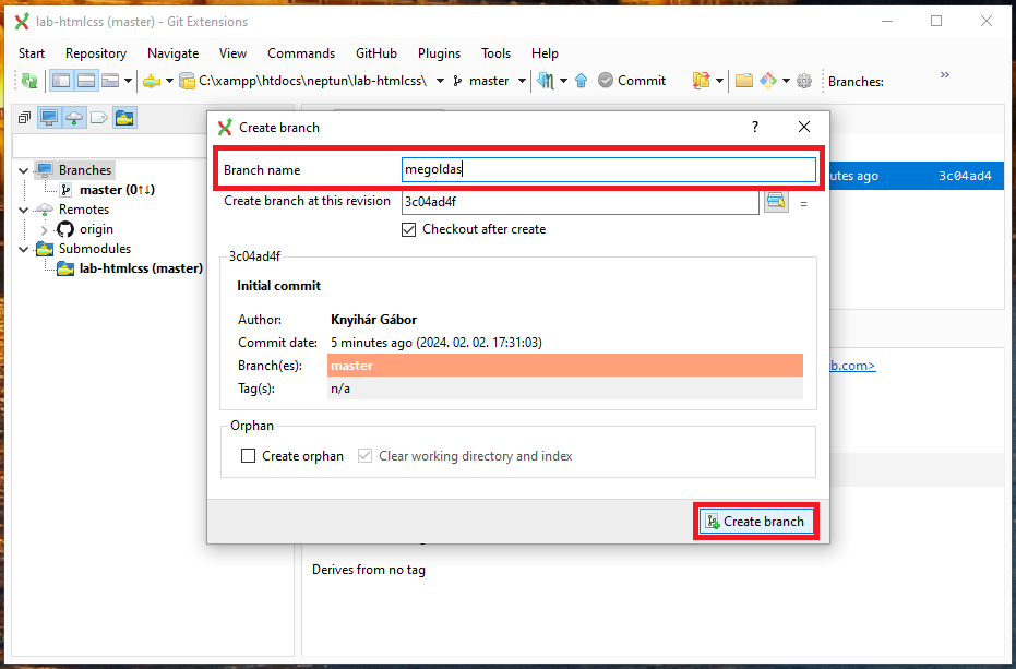 Új branch létrehozásához válasszuk a Commands > Create branch... menüpontot, adjuk meg az új branch nevét, és menjünk a Create branch gombra.