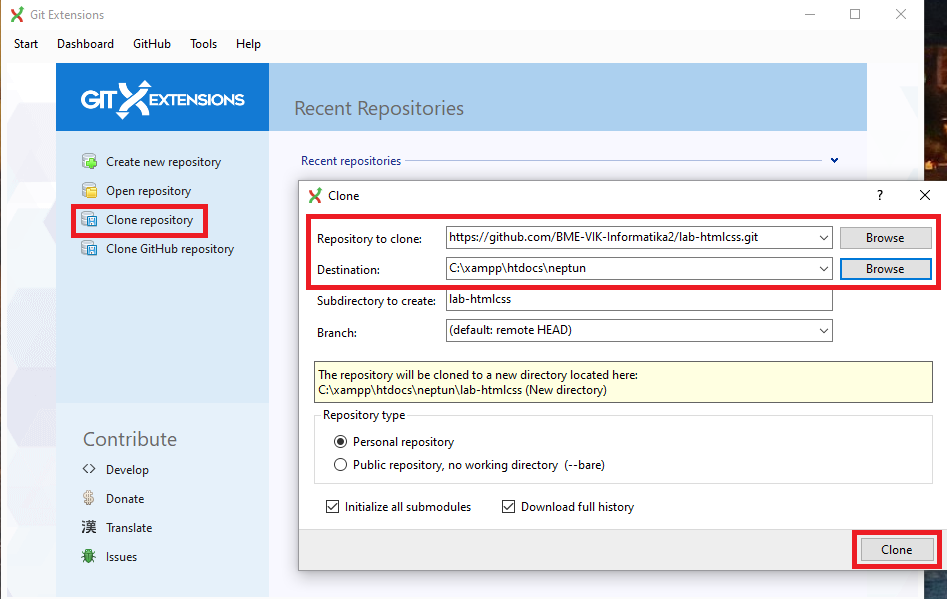 A repository klónozásához válasszuk ki a Clone repository gombot, adjuk meg a kép szerint a megfelelő adatokat, majd menjünk a Clone gombra. Ezután a felugró ablakokat okézzuk le.