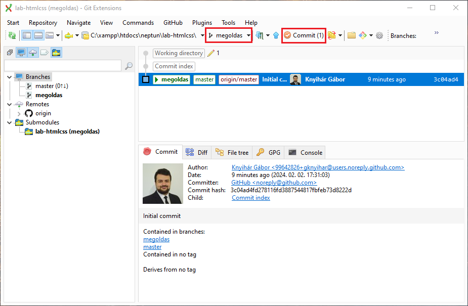 Commitolás előtt ellenőrizzük, hogy a megfelelő branchen vagyunk-e, és menjünk a Commit (..) gombra. A zárójelben a kis szám a változtatások számát mutatja.