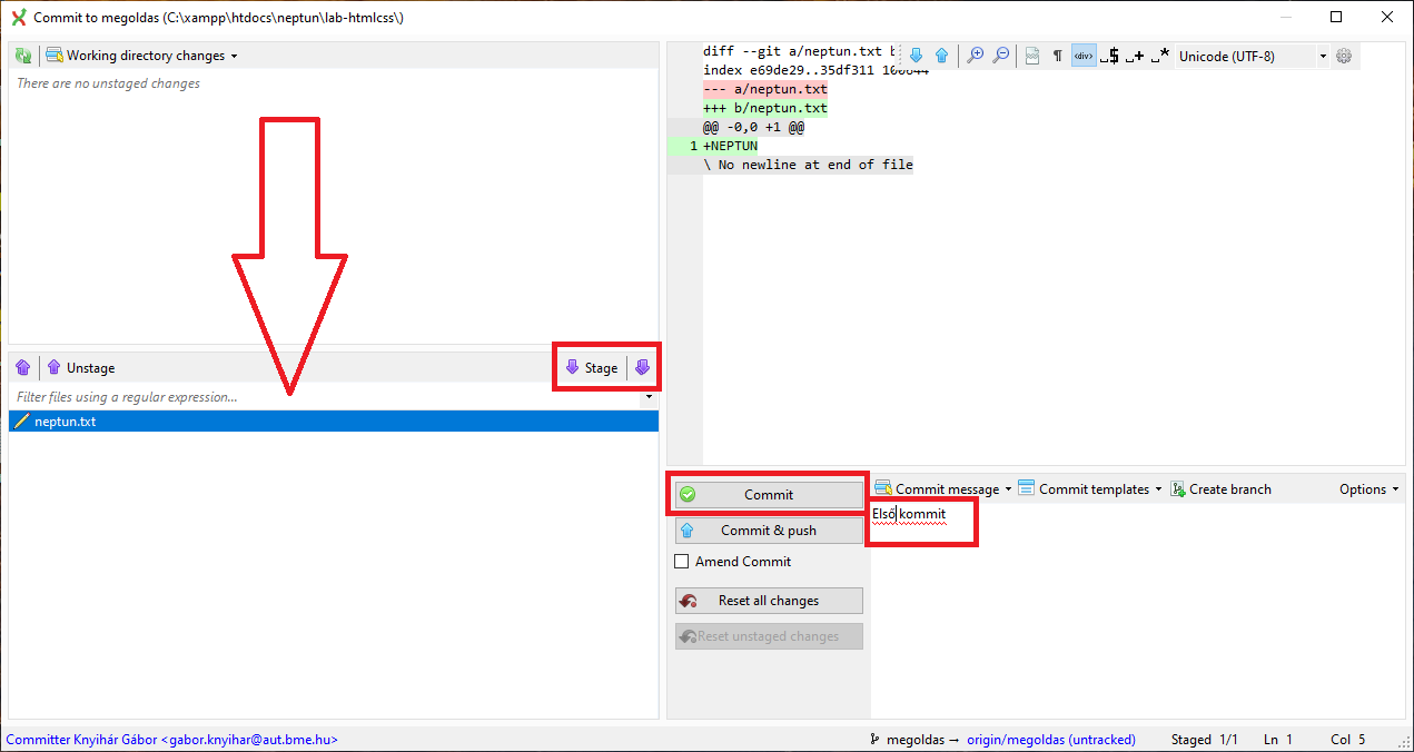 A felugró ablakban válasszuk ki a commitolni kívánt fájlokat és rendezzük őket át az alsó ablakba a Stage gombokkal, majd adjunk meg egy commit üzenetet és válaszuk a Commit gombot.