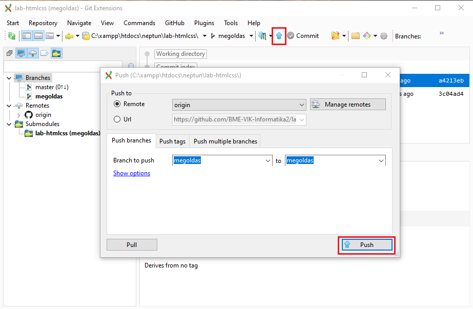 Pusholáshoz menjünk a Push gombra és a felugró ablakban ismét Push. Pusholni commitolással együtt is lehet.