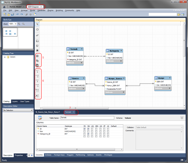 A diagramra elhelyezhető elemeket a függőlegesen megjelenő eszköztárról lehet elhelyezni a diagramon: tábla elemek (5), kapcsolatok (6). A kapcsolatok modellezése során, a több-több kapcsolatokat rögtön átfordítja az eszköz összekapcsoló entitássá. Az egyes táblák szerkesztésére szolgál a táblaszerkesztő (7).